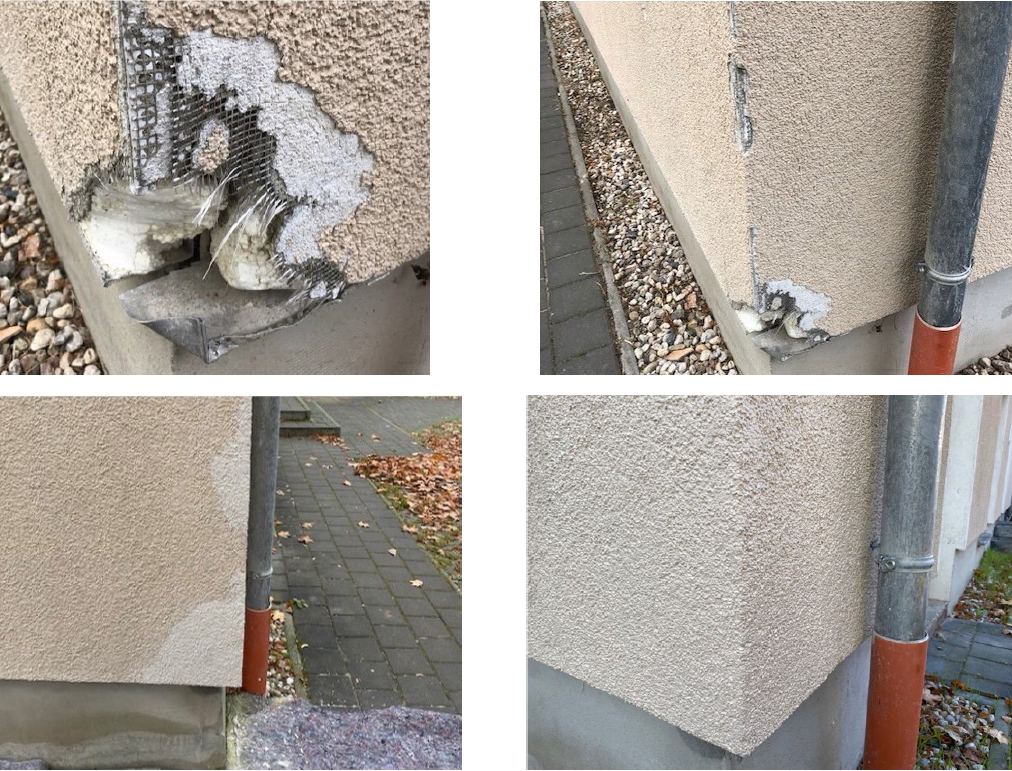 Putzschäden an Fassaden oder Treppenhauswänden. Nach Bauarbeiten oder Umzügen. Wir beseitigen diese Schäden.