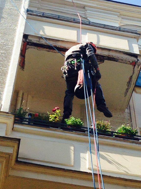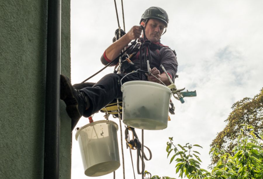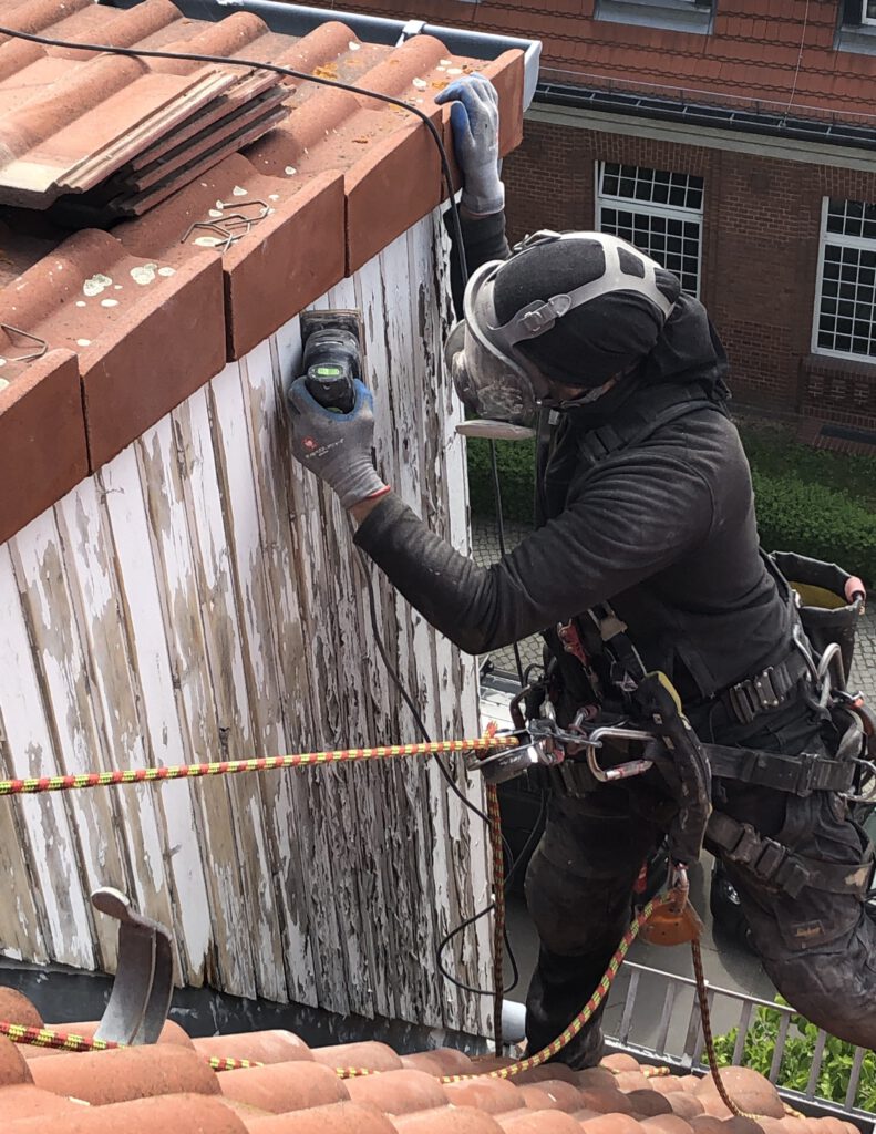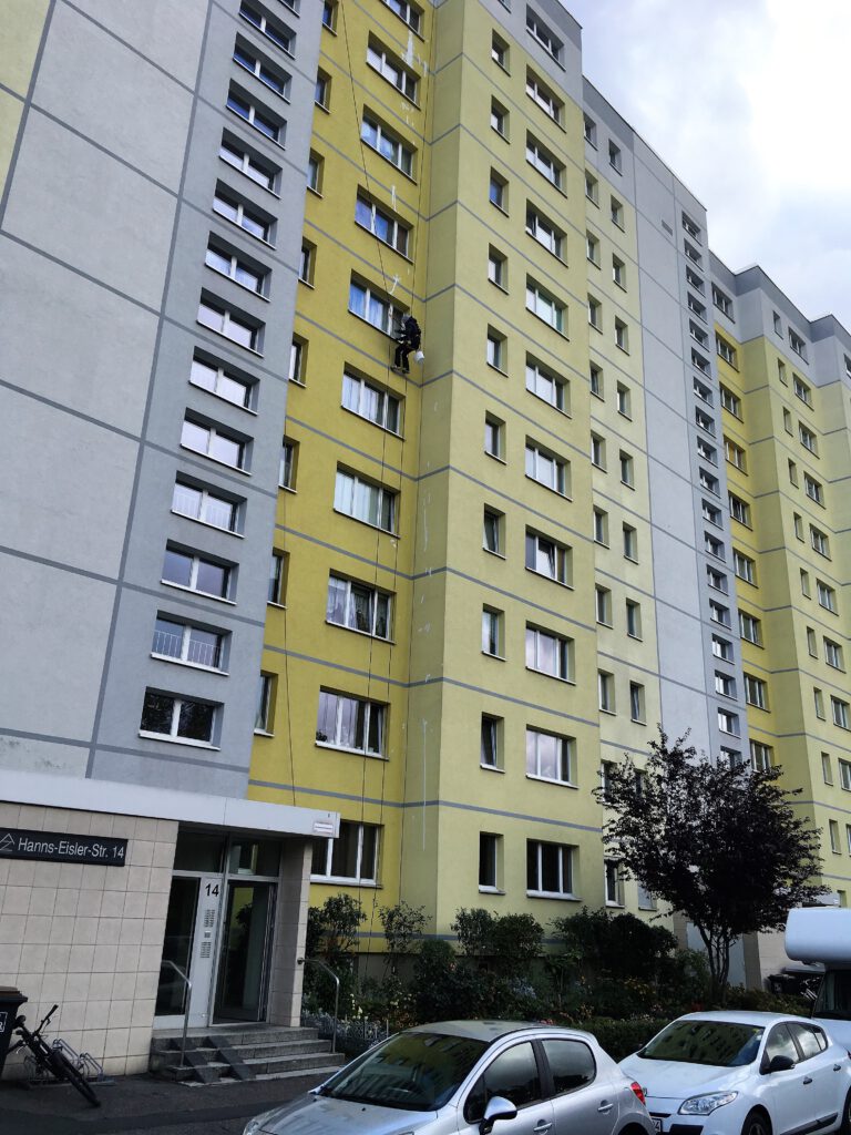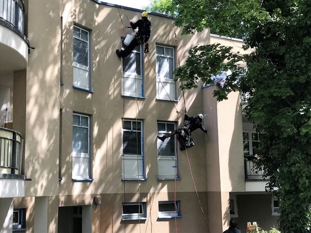 Wir haben mit Hilfe der Seilklettertechnik schon Brandschadensanierungen an der Fassade durchgeführt. Weiterhin Abdichtungsarbeiten, Regenrinnen gereinigt, Putzarbeiten, Malerarbeiten und natürlich inzwischen auch mehrere Tausend Spechtschäden beseitigt.